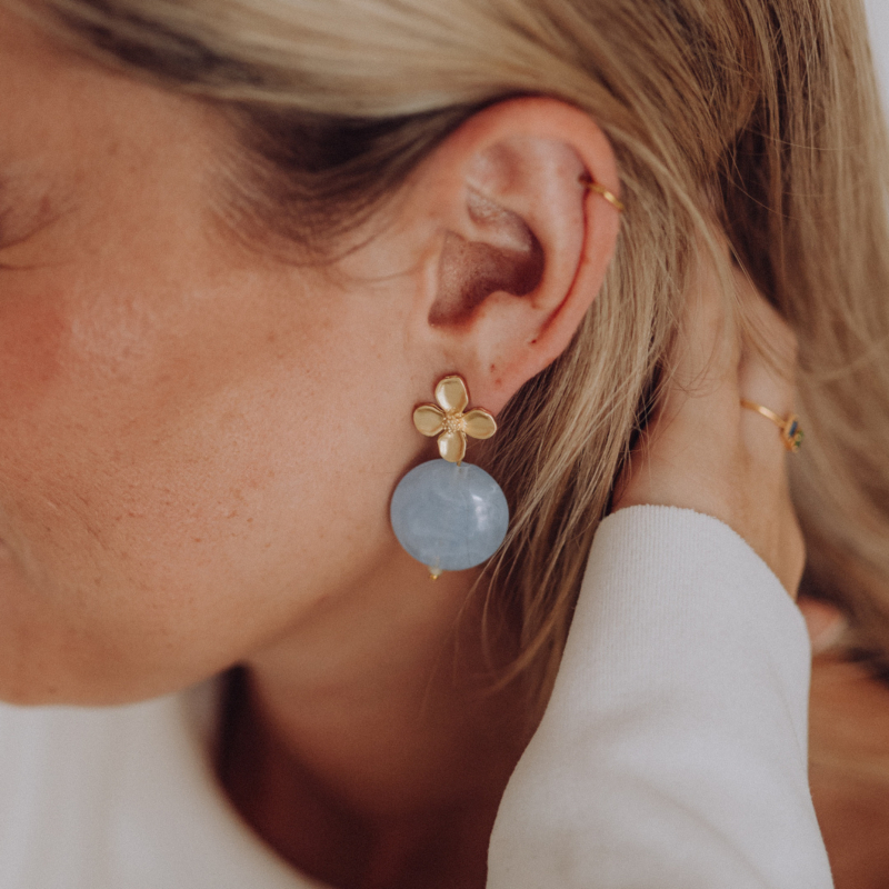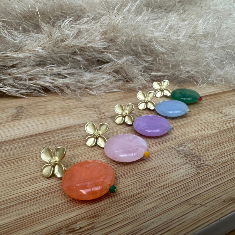Prachtige statement oorbel met bloemvormige steker en kleurrijke ronde steen.